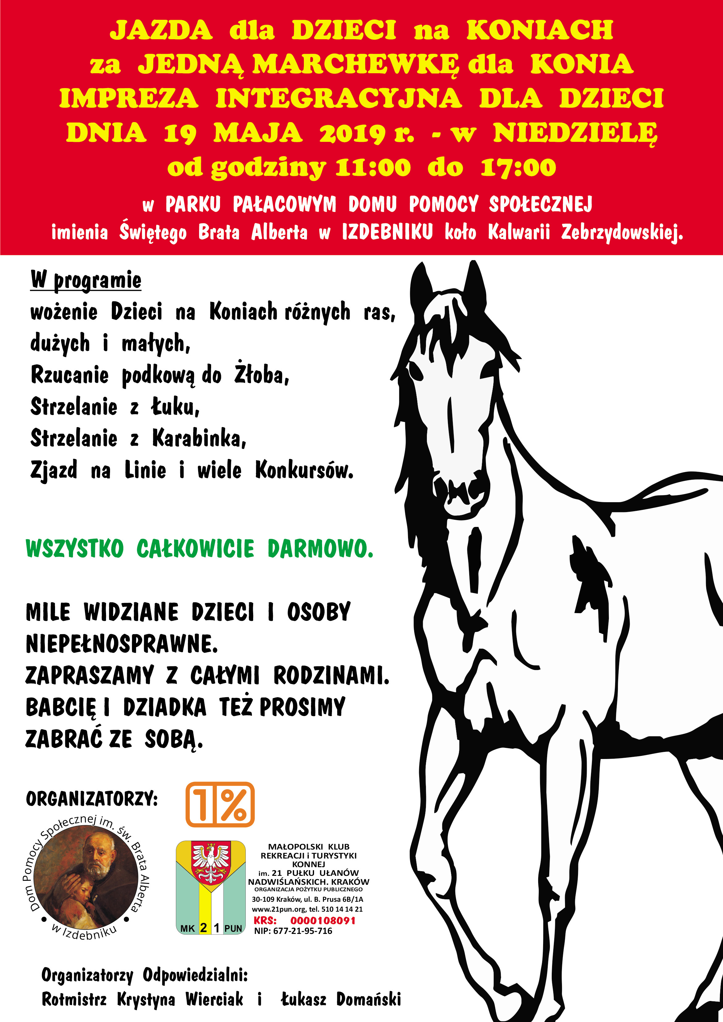 Dnia 19 maja, w niedzielę zapraszamy dzieci, dzieci specjalnej troski, osoby niepełnosprawne do miejscowości IZDEBNIK na coroczną Imprezę Integracyjną "JAZDA na KONIACH dla DZIECI za JEDNĄ MARCHEWKĘ dla KONIA".